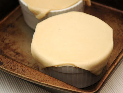 22. Cut thawed puff pastry rounds or squares slightly bigger than the bowl tops and cover each bowl with pastry. Seal the edges of pastry and brush pastry surface lightly with beaten egg if desired.